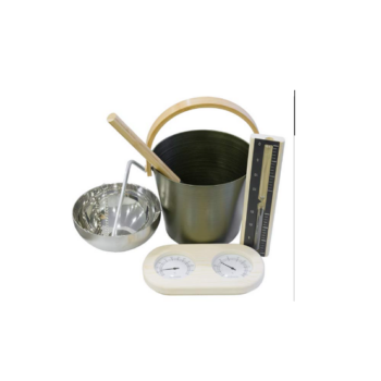 Eine Zusammenstellung des Zubehörs, dass bei einer perfekten Saunaerfahrung nicht fehlen darf. -Thermometer-Hygrometer -Saunaeimer -Schöpfkelle -Sanduhr -Verdampferschale